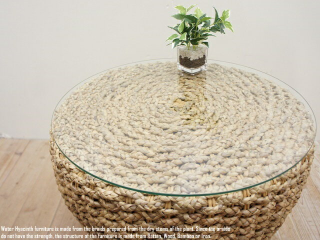 ウォーターヒヤシンス ラウンドテーブル55 ガラストップ サイドテーブル 送料無料 アジアン家具 ナイトテーブル コーヒーテーブル 天然木 ラタン 籐 モダンアジアン 完成品 組立不要 バリ家具 インドネシア バリ島製 業販 卸 スーパーセール 父の日