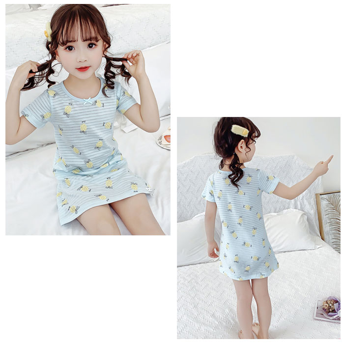 韓国子供服 パジャマ ワンピース 女の子 ルームウェア 部屋着 綿 丸首 半袖 ストライプ柄 プリント ブルー ピンク ホワイト ルーム キッズ ガールズ 快適 ナイトウェア 夏着 可愛い 90 100 110 120 130 140 150 160cm