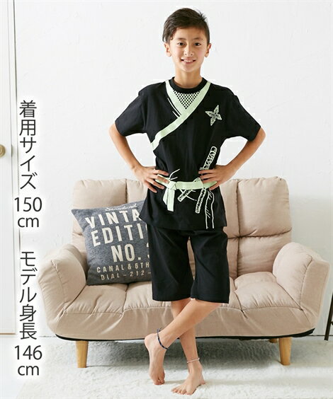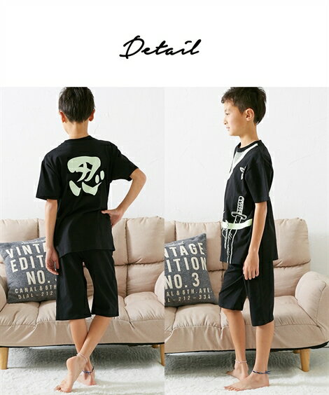 綿100% 光るプリントパジャマ(半袖Tシャツ+ハーフパンツ)(男の子・女の子 子供服) ニッセン nissen 黒系(忍者) ミント+ネイビー(くじら) オフ+ミント(ネコ) 赤+ネイビー(恐竜) カラー 黒系(忍者)/ミント+ネイビー(くじら)/オフ+ミント(ネコ)/赤+ネイビー(恐竜) サイズ 110/120/130/140/150/160 備考 単位:cm ※サイズの誤差は多少発生します。